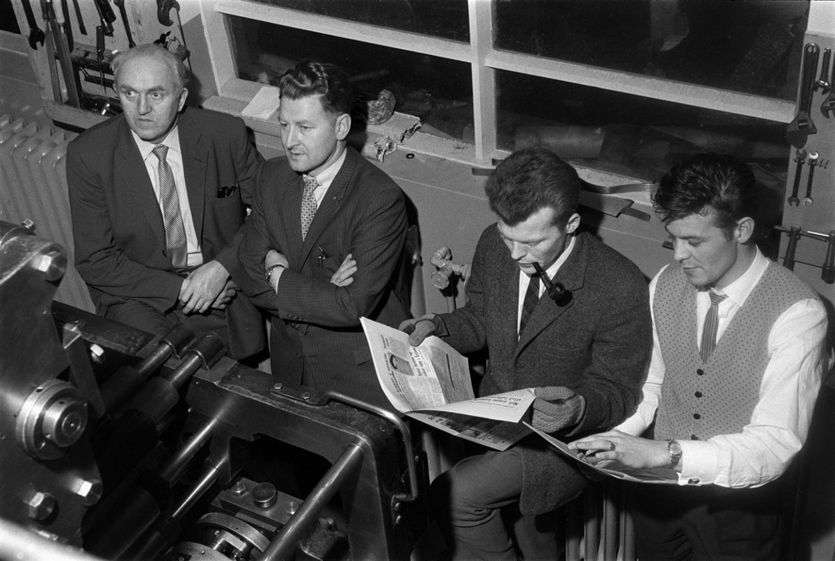 Nýja rotationvél Tímans. Karlmenn skoða hvernig blaðið kemur út. „Tómas Árnason ráðherra 2. fv og Jökull Jakobsson við hlið hans th.“ (ILB 2020)