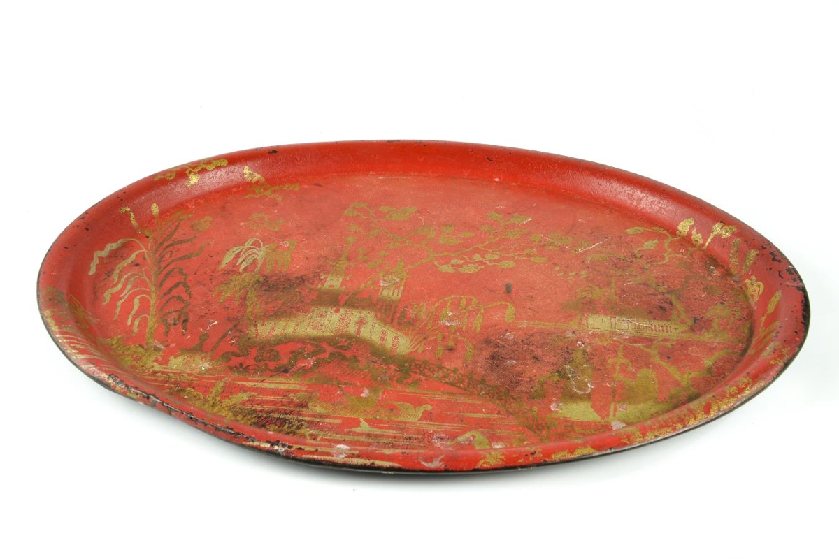 Sporbaugslaga matarbakki úr málmi. Rauðmálaður með gylltri skreytingu. Myndin á bakkanum er með nokkuð austurlensku ívafi, en myndin er skuggamynd af musteri, pálmatrjám, bát á vatni o.fl. Það eru þónokkrar skemmdir í myndinni, málningin að flagna af sums staðar og áberandi blettir á mörgum stöðum. Úr eigu Jóhanns Stefánssonar, dívanasmiðs á Siglufirði (föður gefanda).