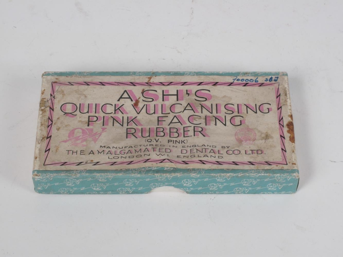 Þrír kassar af hrágúmmíplötum (kátsjúk). Í einum kassanum er ekkert gúmmí, en þess í stað samanbrotin álþynna og 4 gervitennur.