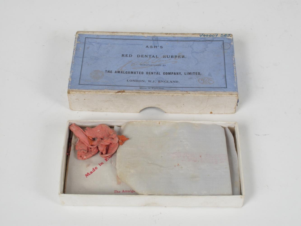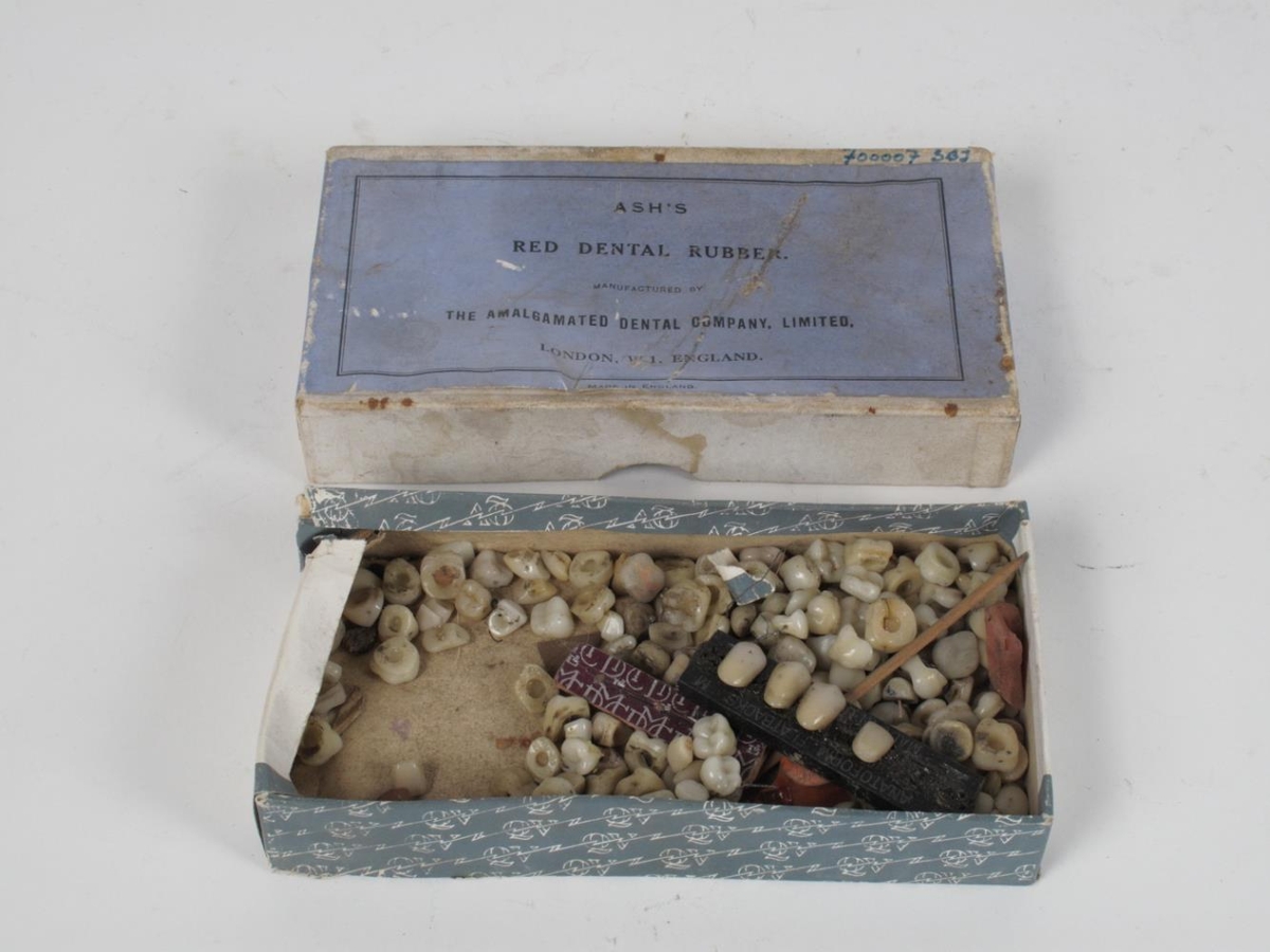 2 kassar, annar með heilum og hálfum postulínstönnum, afgangar eða ónotaðir hlutar úr tannsmíðum. Í hinum kassanum eru hrágúmmíplötur (kátsjúk) notaðar til tannsmíða.