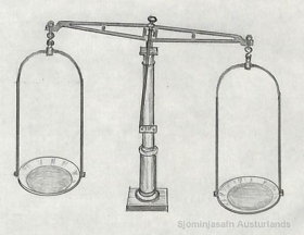 Jafnarma vog til að vega með þegar verið var að blanda meðöl í apóteki héraðslæknisins á Eskifirði. Úr fórum Einars Ástráðssonar læknis sem var héraðslæknir á Eskifirði frá 1931. Gefandi er dóttir hans.