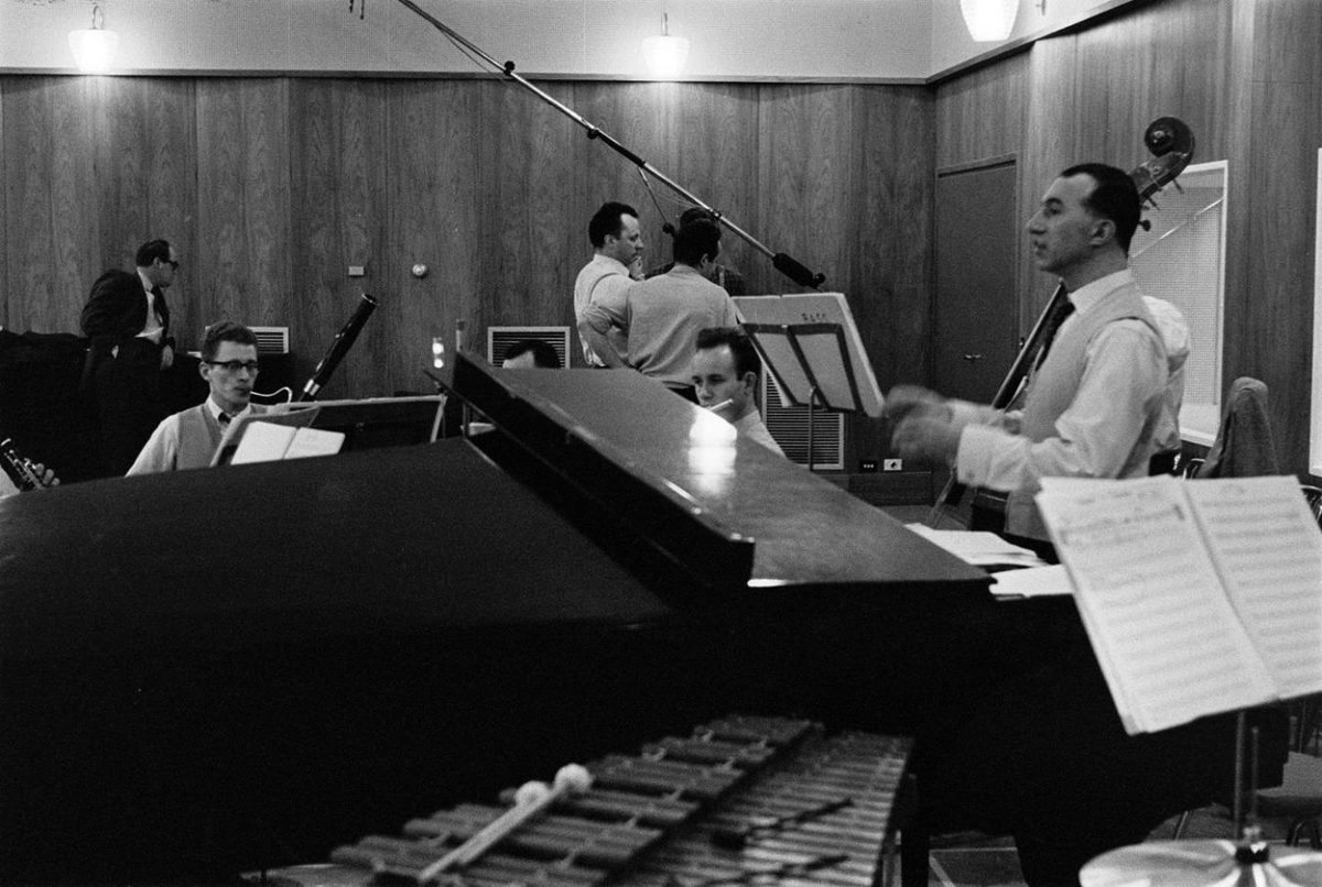 Upptaka á Kardemommubænum. Karlmenn spila á hljóðfæri.