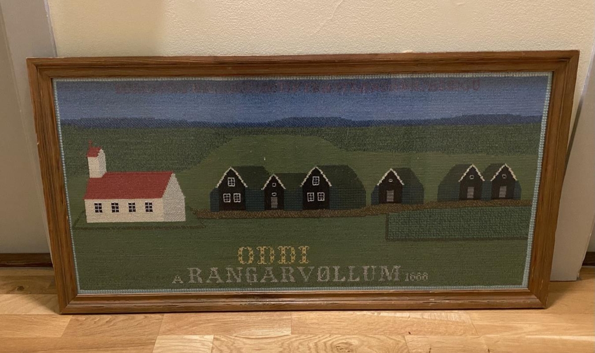 Útsaumuð mynd í krosssaumi. Sýnir bæinn og kirkjuna á Odda á Rangárvöllum, bær sr. Matthíasar Jochumssonar um 1888. Var saumuð af Þorbjörgu Halldórsdóttur (1875-1979) á svipuðum tíma og R-3143 til R-3146, þegar Þorbjörg var 95-100 ára (1875-1979). Saumuð eftir lítilli ljósmynd.