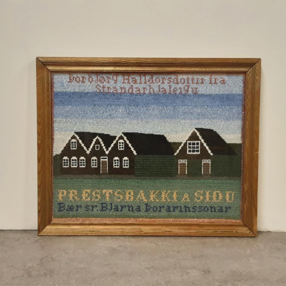 Útsaumuð krosssaumsmynd: Prestbakki á Síðu, bær sr. Bjarna Þórarinssonar 1883. Myndir þessar, nr. 3143-3146 eru allar saumaðar eftir litlum ljósmyndum, með marglitu garni, af Þorbjörgu Halldórsdóttur, þá 95 ára gamalli.