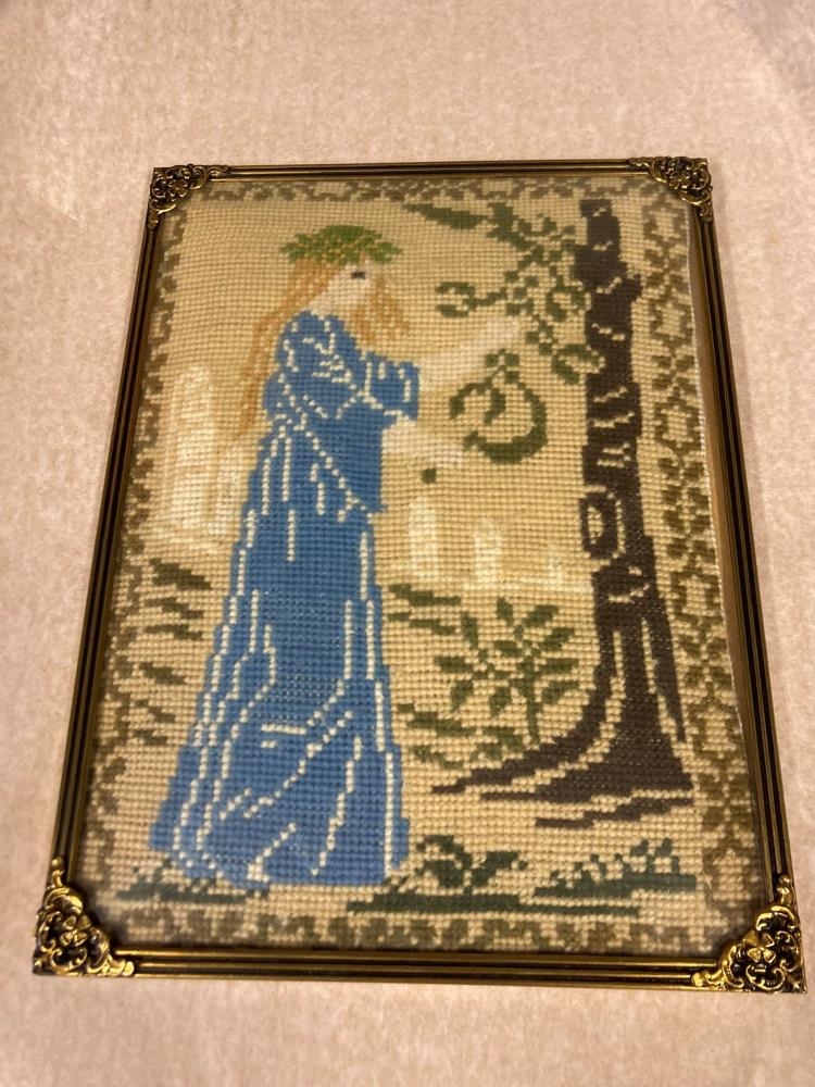 Mynd, saumuð krosssaumi, innrömmuð. Myndefni: Skykkjuklædd kona með höfuðskart stendur framan við laufguð tré. Stærð 24,5 x 18 cm. Verk Sigurlínar Stefánsdóttur.