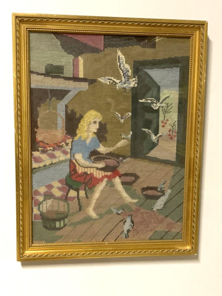 Krosssaumsmynd, innrömmuð. Verk Sigríðar Einarsdóttur. Myndefni sitjandi kona með kornkörfu í kjöltu og fuglar fljúgani inn um glugga. Stærð 54 x 42,5 cm.