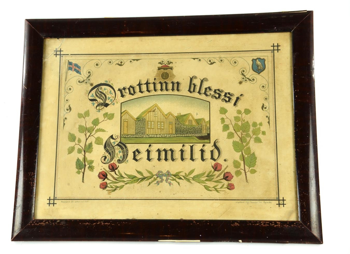 Innrömmuð mynd. Á hana er teiknuð mynd af torfbæ og skrifað með skrautstöfum: Drottinn blessi heimilið. Útgefandi: Páll Jónsson frá Ægissíðu, Reykjavík, 20. september 1917.