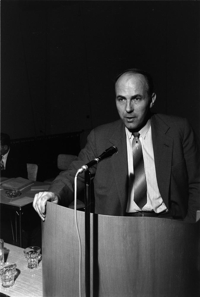 Aðalfundur Mjólkurbús Flóamanna að Flúðum þann 12. apríl 1960. Karlmaður flytur ræðu. „Hjalti Gestsson ráðunautur.“ (ILB 2020)