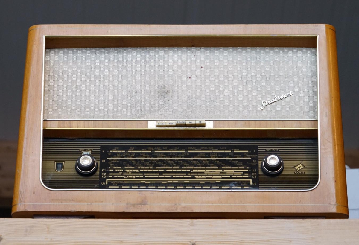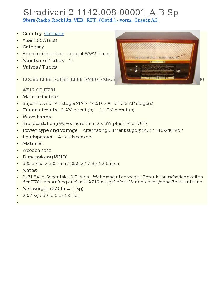 Útvarpstæki, Stern Radio Stradivari2. 11 lampa útvarpstæki framleitt í Þýskalandi 1957. Bylgjusvið Long Wave, more than 2 x SW plus FM or UHF. Superhet with RF-stage; ZF/IF 440/10700 kHz; 3 AF stage(s) stillanleg 9 AM og 11 FM Spennugjafi AC) / 110-240 Volt. Hátalarar 4, bassahátalari og diskant. Framleiðandi: Stern-Radio Rochlitz, VEB, RFT, (Ostd.) - vorm. Graetz AG Þýskaland.