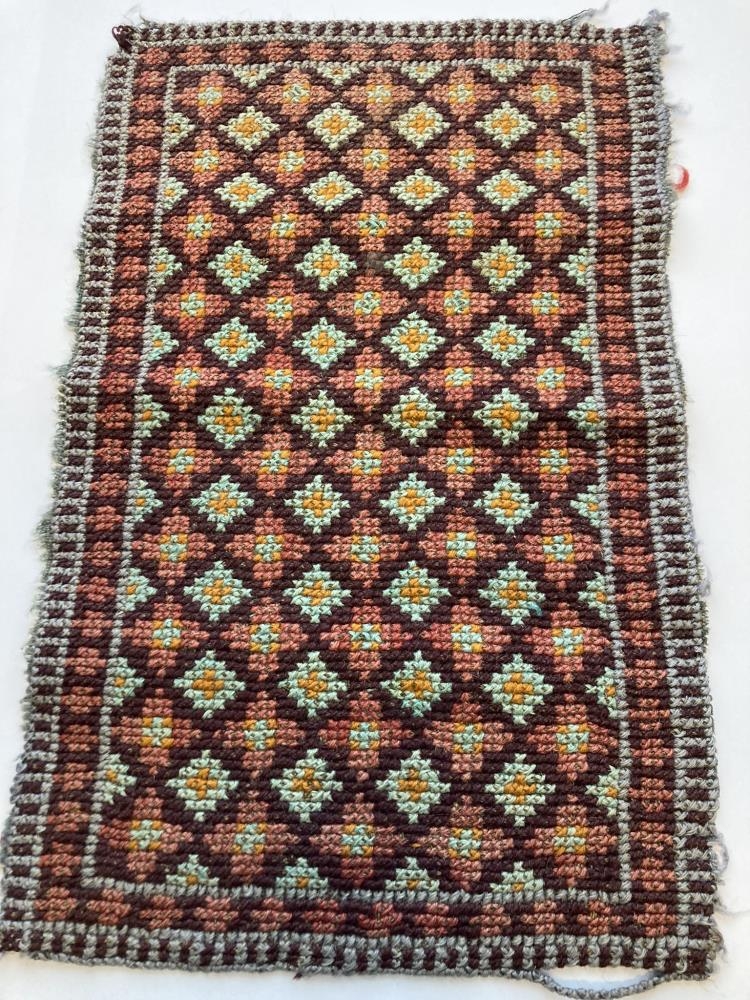 Útsaumur, 49 x 32 cm. Tíglareitir í litum (Krosssaumur). Ætlað í púða. Verk Sigurlínar Stefánsdóttur, móður gefanda.