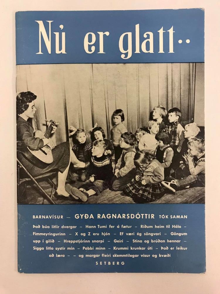Vísnabókin - Nú ert glatt.. - Gyða Ragnarsdóttir tók saman. Myndskreytingar: Bjarni Jónsson. Bókin er blá með ljósmynd á kápu, kona situr í stól og spilar á gítar. Fyrir framan hana situr hópur af börnum.