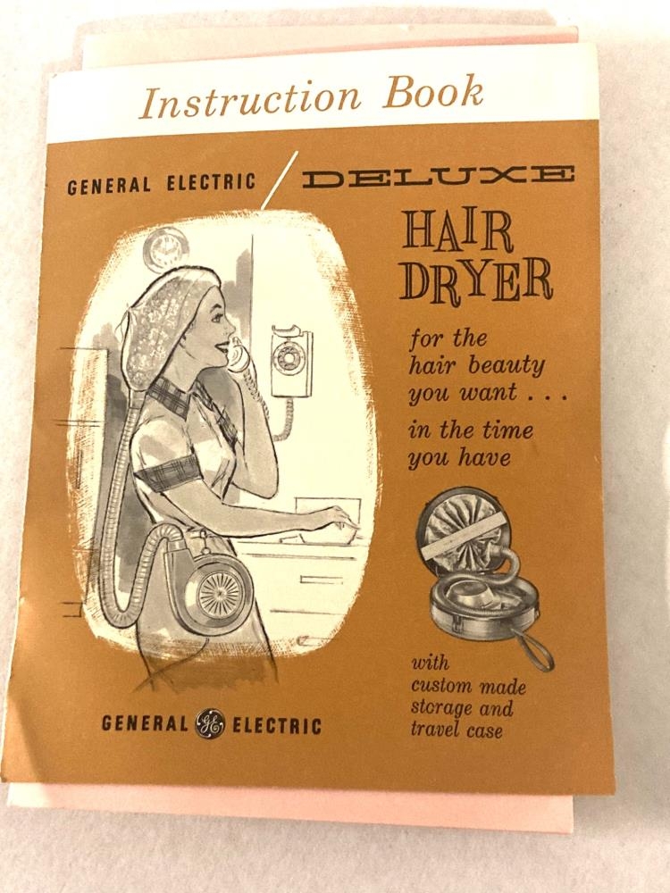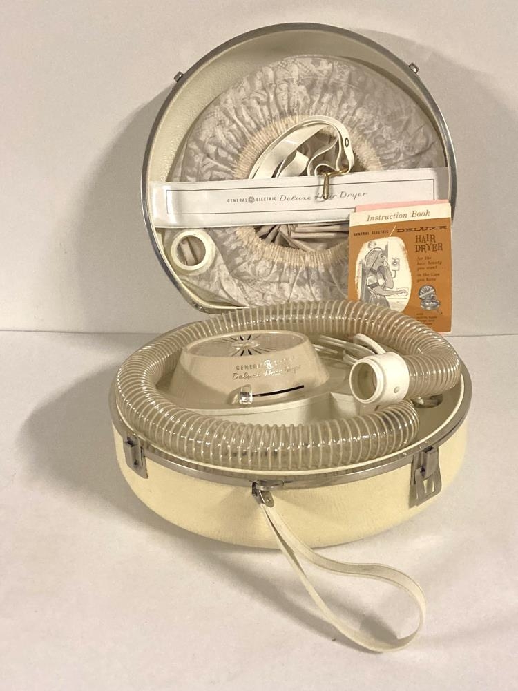 Rafmagns hárþurrkari."General Electric Hair Dryer". Í hvítri kringlóttri tösku.