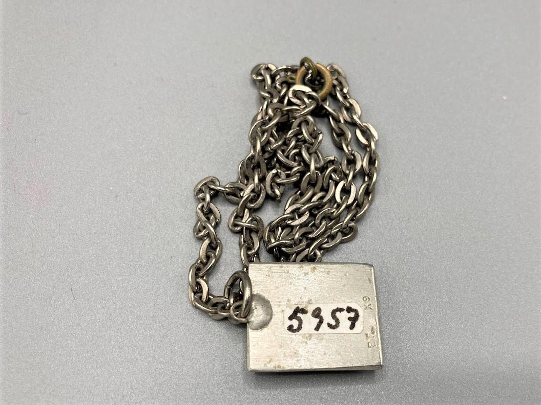 Hálsmen með silfurfesti. Það er 2,1 x 1,6 cm að stærð. Í það er greyptur sporöskjulaga, fjólublár steinn. Á bakhlið merking:BT.x 9. Gefið af Ólöfu Jónsdóttur í Löngubrekku 16 í Kópavogi. Skartgripir systur hennar, Elínar frá Dufþaksholti og hennar eigin.
