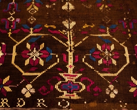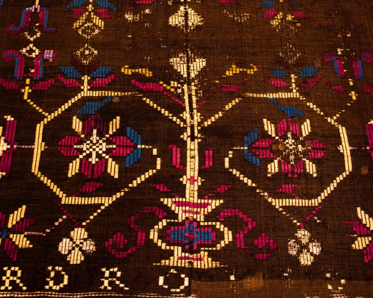 Glitofið söðuláklæði, grunnur svartur, glit í hvítum, gulum, fjólubláum og bláum litum. Vasi með löngum blómagreinum á hvorum helming, munsturbekkir í kring. Svartur bómullarborði við brún á röngu, handsaumaður við áklæðið. Merkt: SIGRIÐUR _O____DOTTIR.