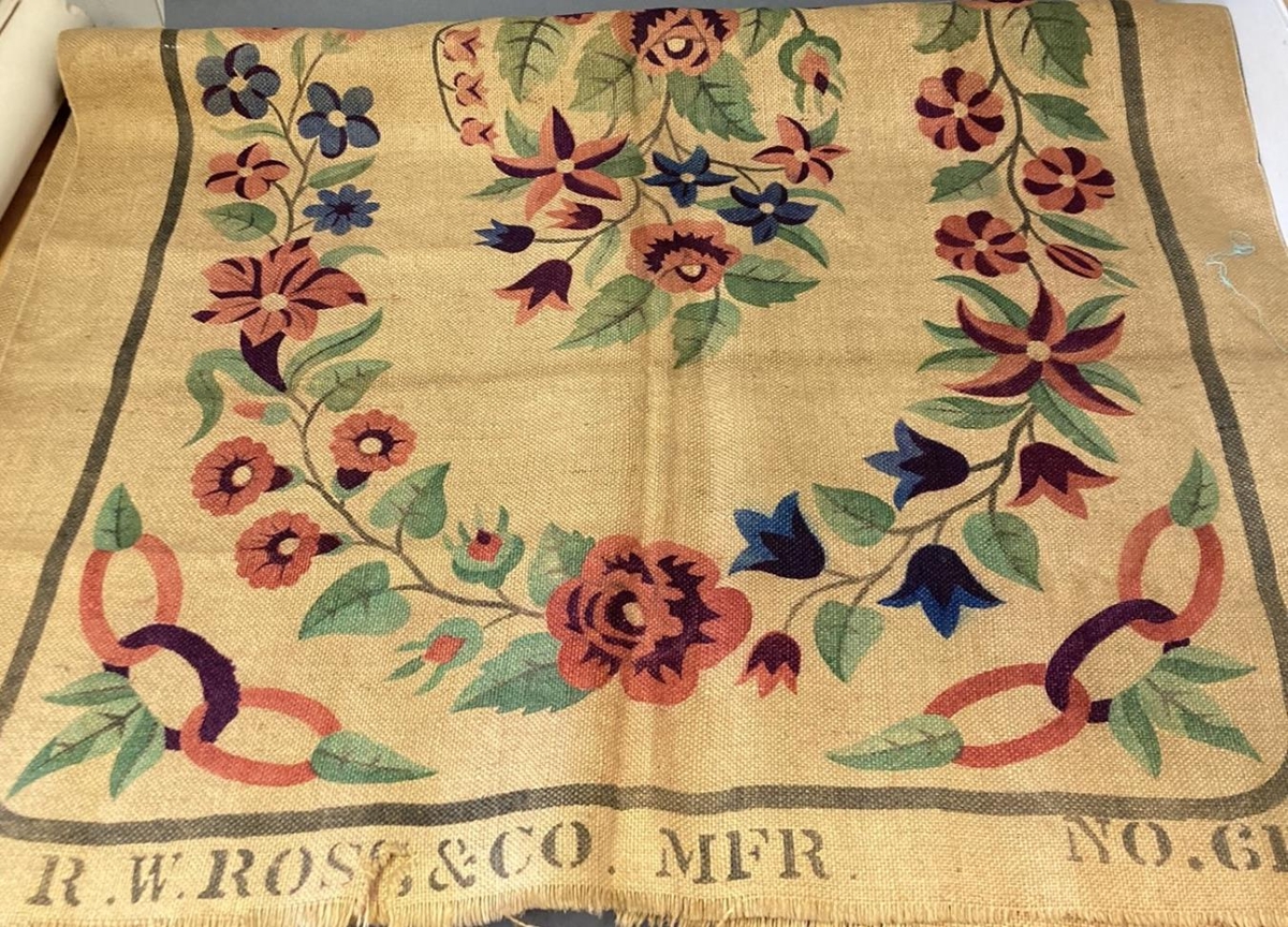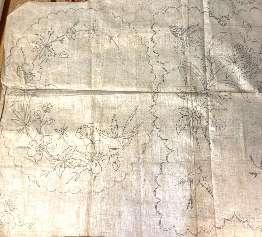 Útsaumsuppdrættir og hessianstrigi litaður undir útsaum. Uppdrættirnir teiknaðir á léreft. Úr eigu Torfhildar Hólm skáldkonu.