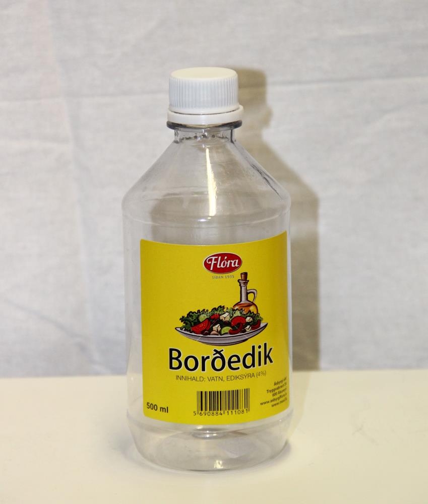 Glær plastflaska með hvítum tappa og marglitum miða. Áletrun á álímdum miða: Flóra - síðan 1935 - Borðedik - Innihald: Vatn, ediksýra (4%) - 500 ml. - Ás yrgi ehf - Tryggvabraut 24, 600 Akureyri - www.asbyrgiflora.is - www.maxi.is