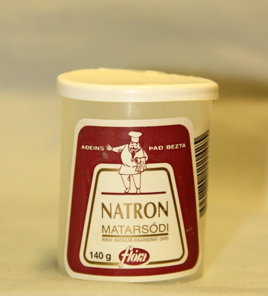 Glær plastdós með hvítu loki. Áletrun á álímdum miða: Aðeins það besta, og mynd af bakara. Natron - Matarsódi - 1400 gr. - Flóra.