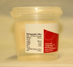 Dósin er glær með álímdum miða í rauðum og hvítum lit. Áletrun: Flóra - Síðan 1935 - Engifer. Dósin innihélt 60 grömm af engiferi.