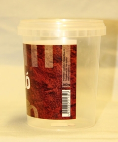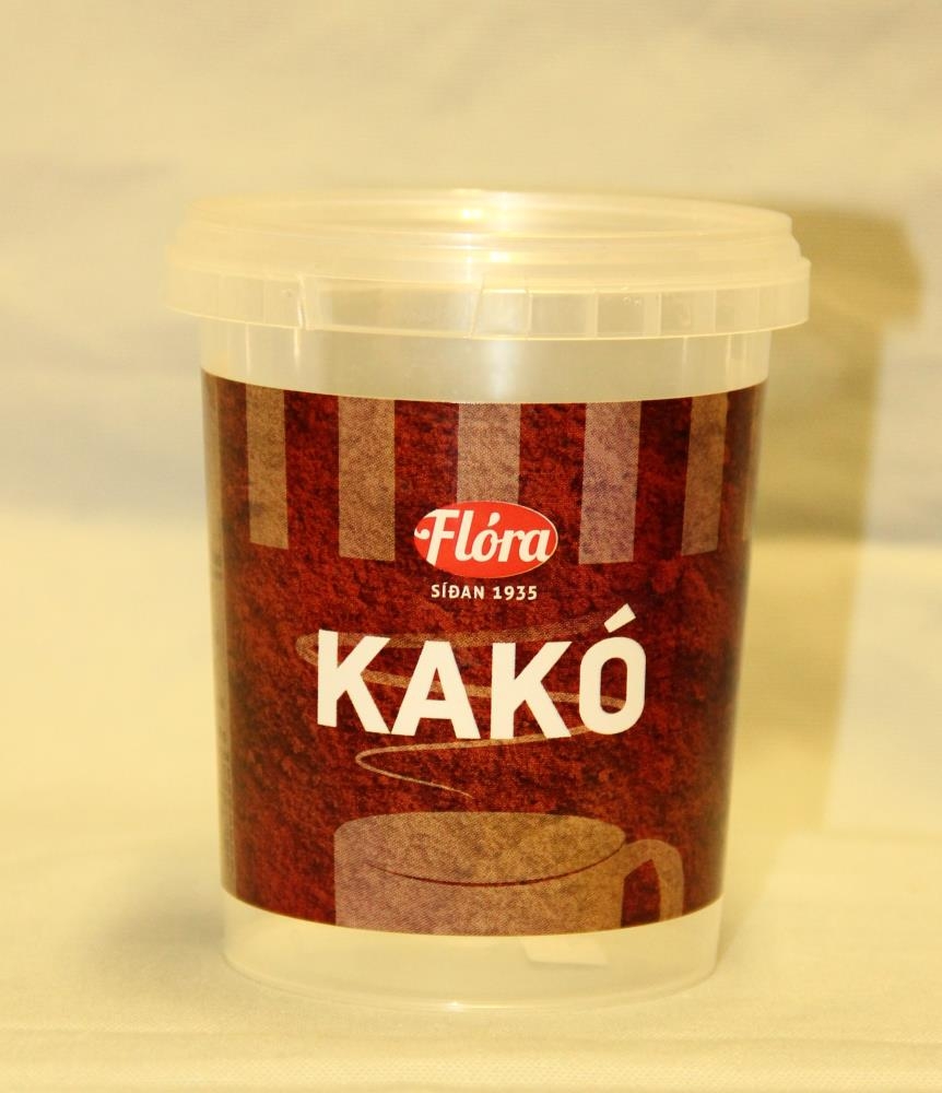 Plastdósin er glær með glæru loki og álímdum miða í brúnum, dröppuðum og rauðum lit og hvítu letri. Áletrun: Flóra - Síðan 1935 - Kakó - Mynd af rjúkandi kakóbolla. Í dósinni voru 200 grömm af kakódufti.