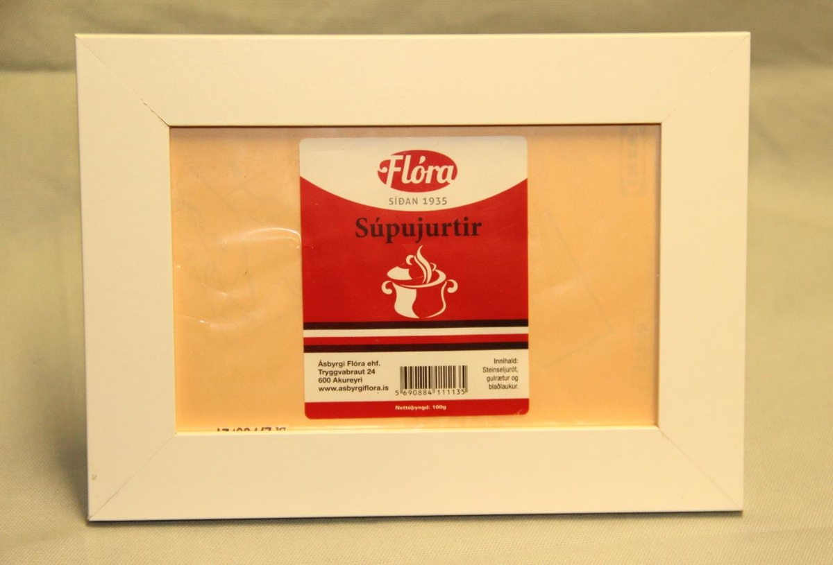 Plastpokinn er glær með álímdum miða í rauðum, hvítum og svörtum lit. Áletrun: Flóra - Síðan 1935 - Súpujurtir - Mynd af rjúkandi súpupotti. Upplýsingar um fyrirtækið - Strikamerking - Innihaldslýsing - Nettóþyngd: 100 gr.