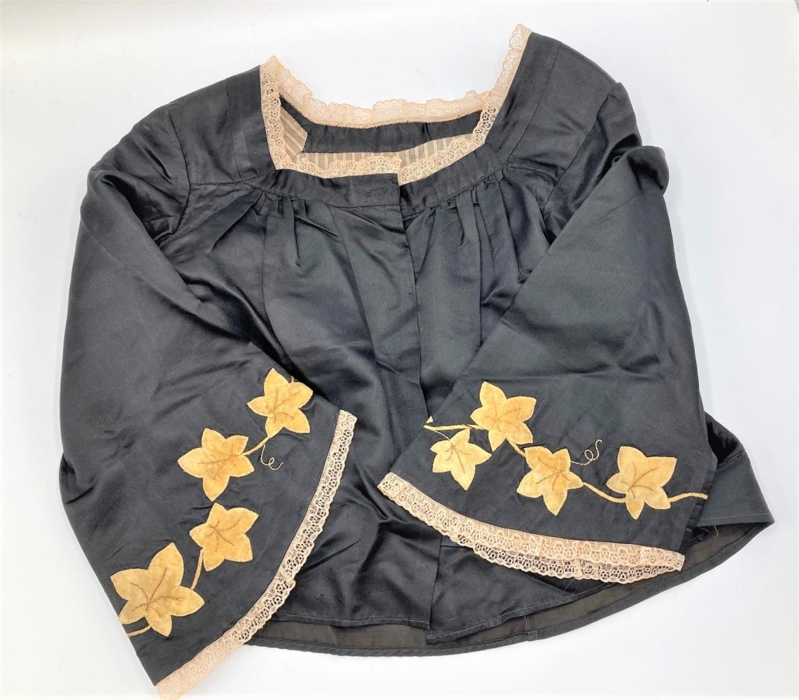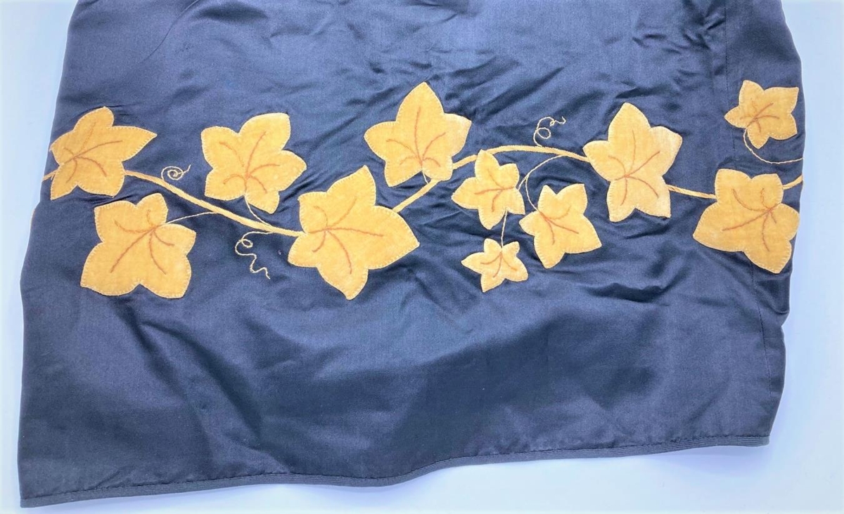 Tvískiptur kyrtill, pils og treyja, einnig faldur, slör og slaufa. Munsturbekkur neðst á pilsi og ermum, ásaumuð gul flauelslaufblöð. Munstur teiknaði Benedikt Gröndal.