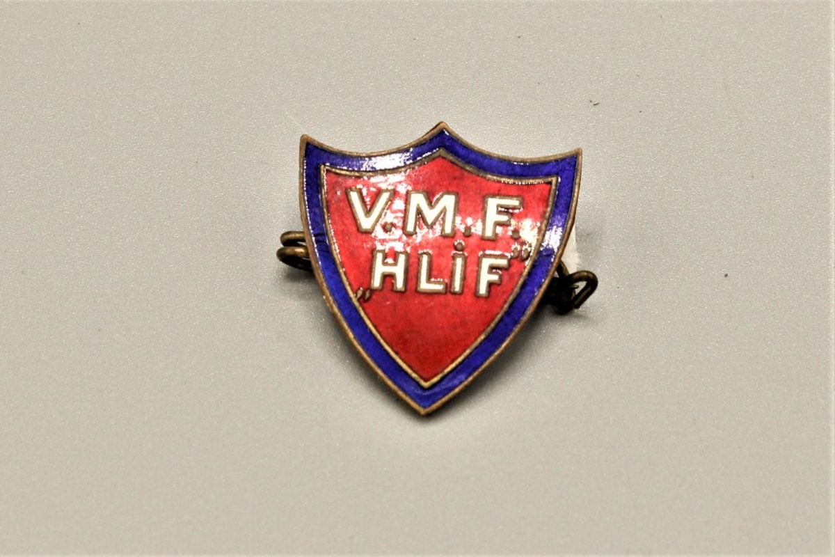 Félagsmerki frá Verkamannafélaginu Hlíf, skjaldarlaga: VMF HLÍF.