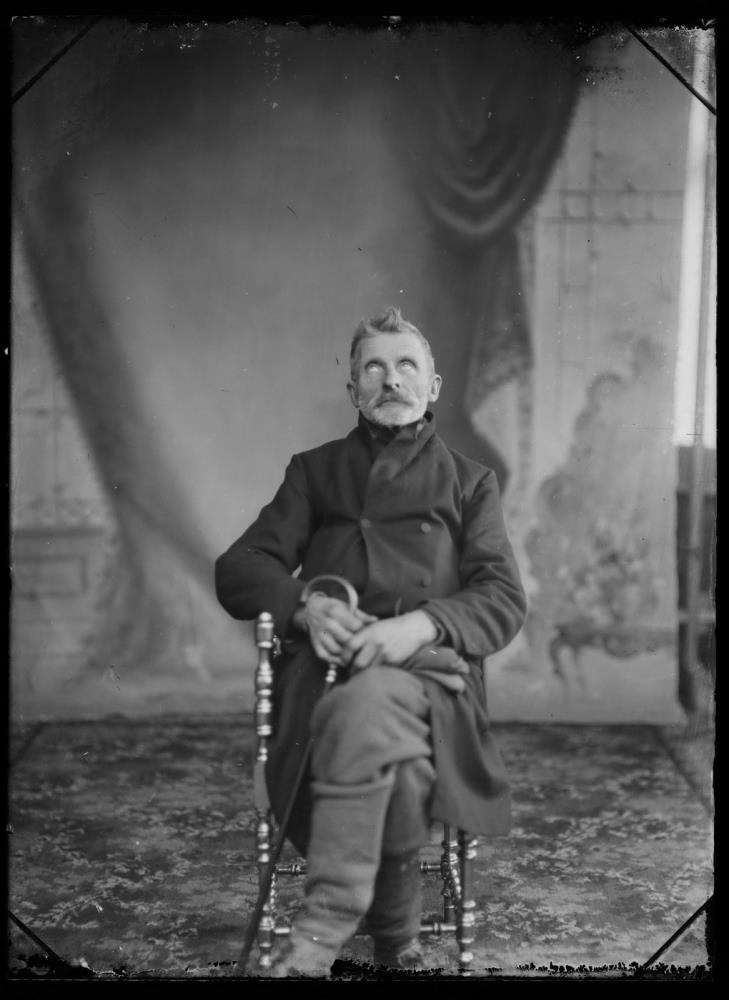 Karlmaður með staf í hendi. Sitjandi.