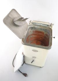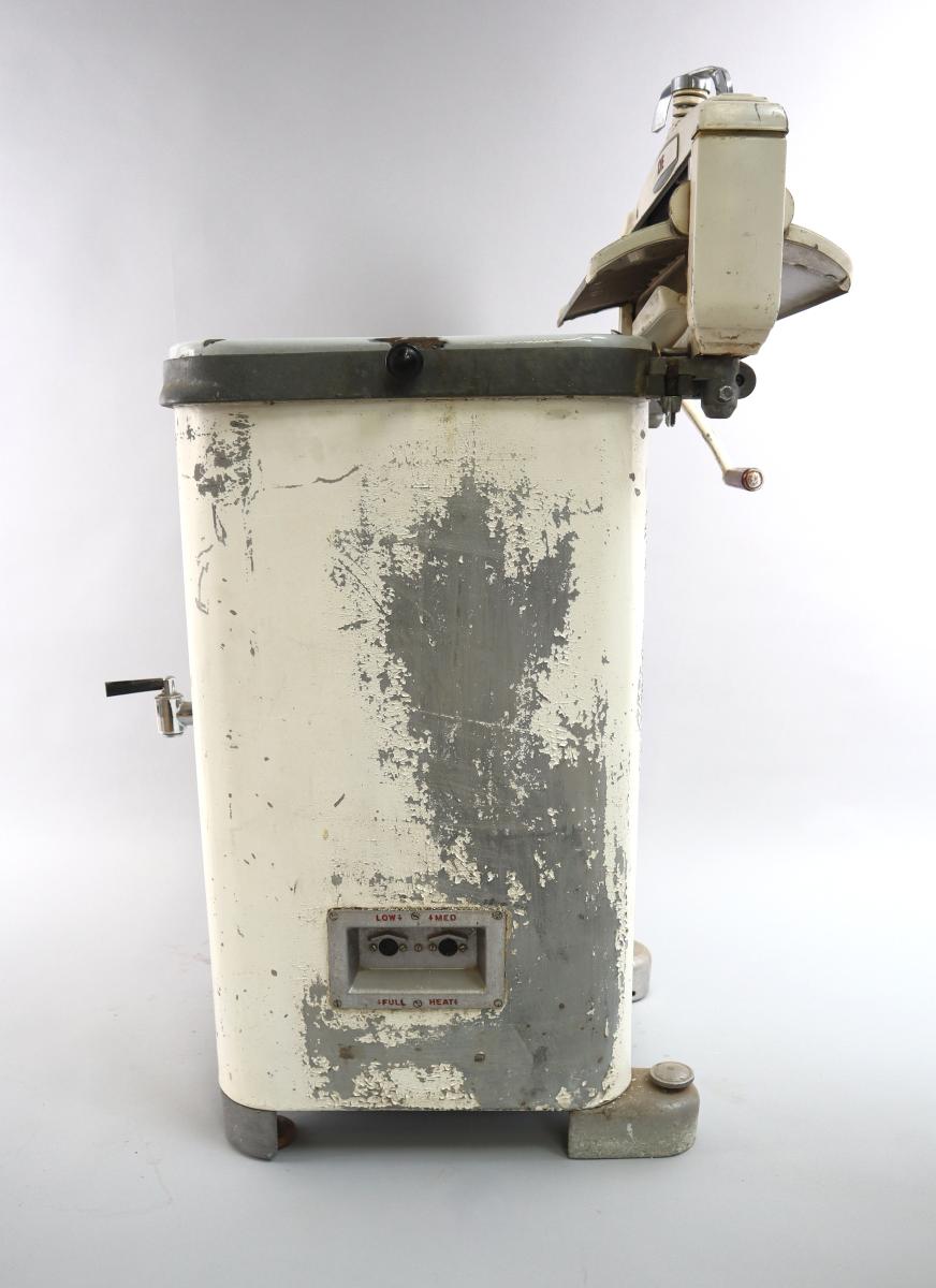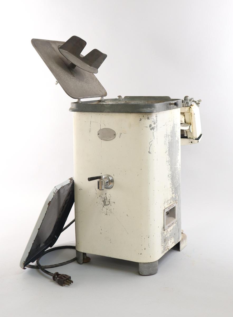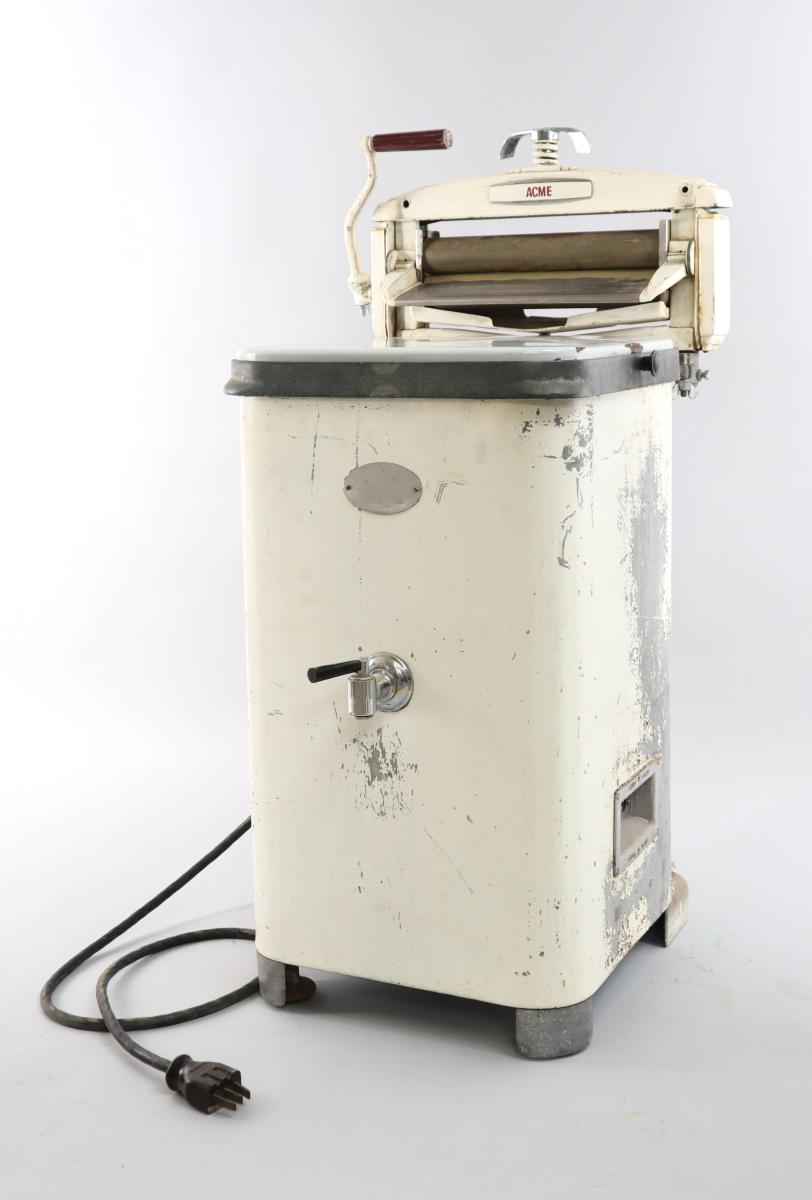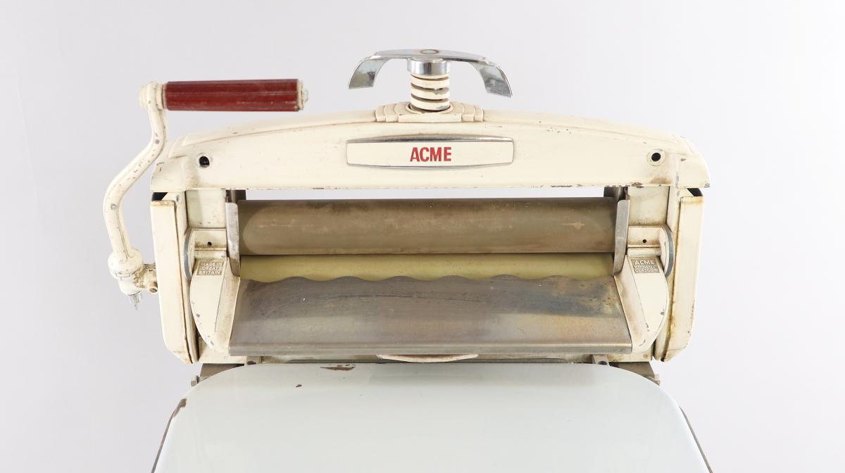Þvottavél með handsnúinni vindu. Áletrun á vélinni: "ACME", "MADE IN GREAT BRITAIN" og " ACME WRINGERS LTD GLASGOW".