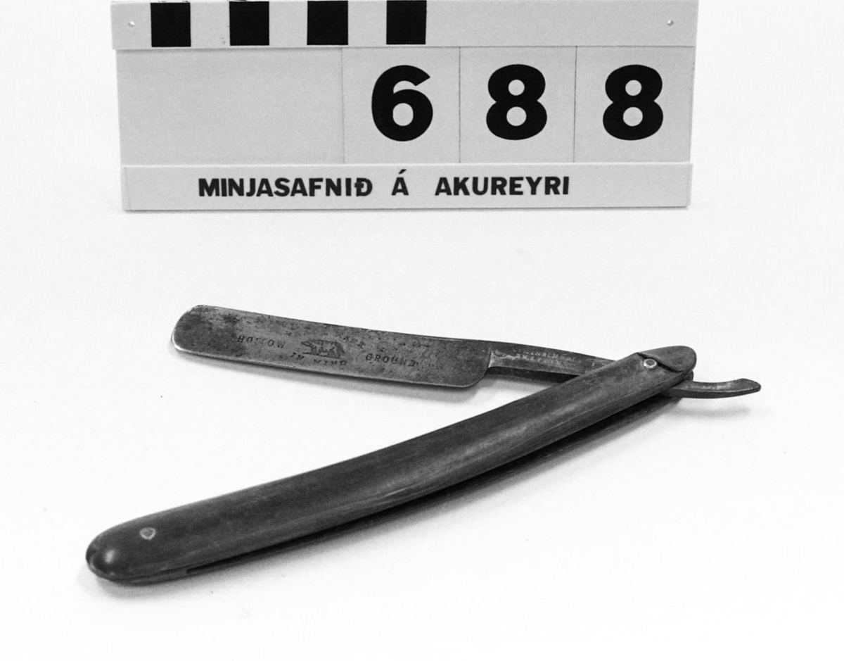 með svörtu skafti. Á blaðinu stendur "HOLLOW GROUND, TRADE MARK,