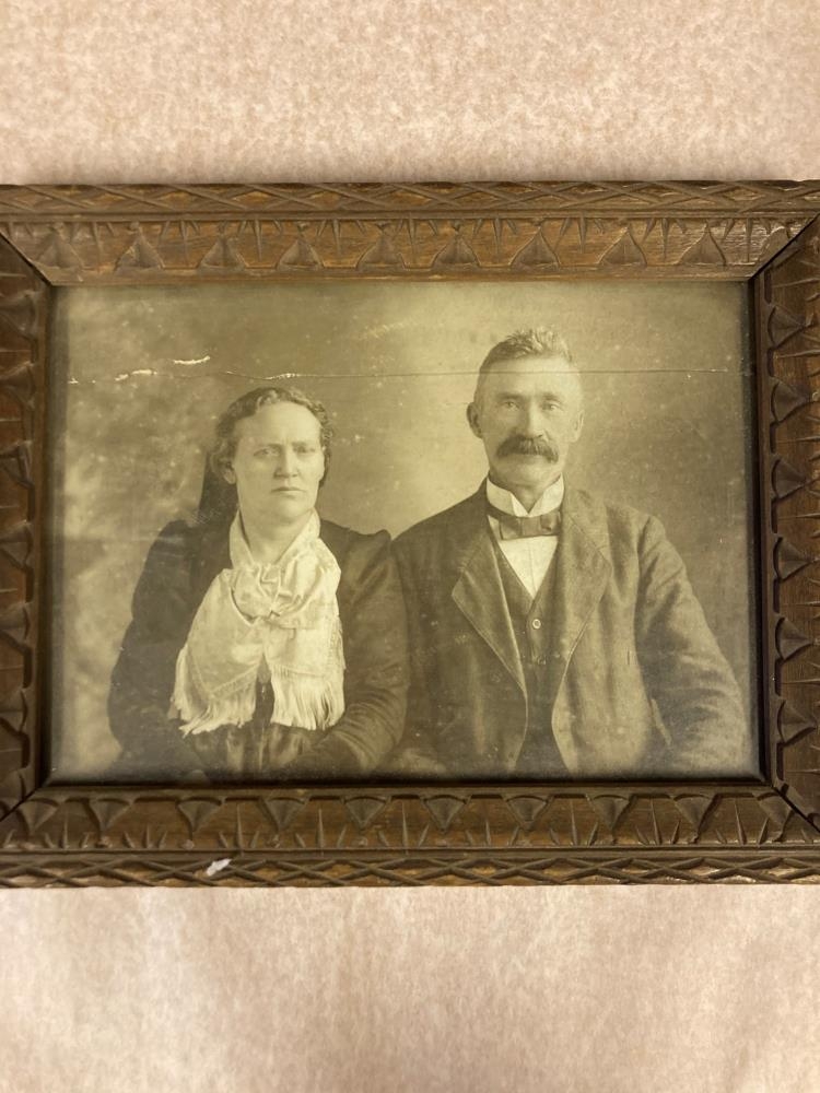 Innrömmuð ljósmynd af foreldrum gefanda, þeim Jóni Sighvatssyni bóksala og konu hans Karolínu Oddsdóttur, 17 x 13 cm. Gefandi Jónína Jónsdóttir frá Jómsborg, Vestmannaeyjum.