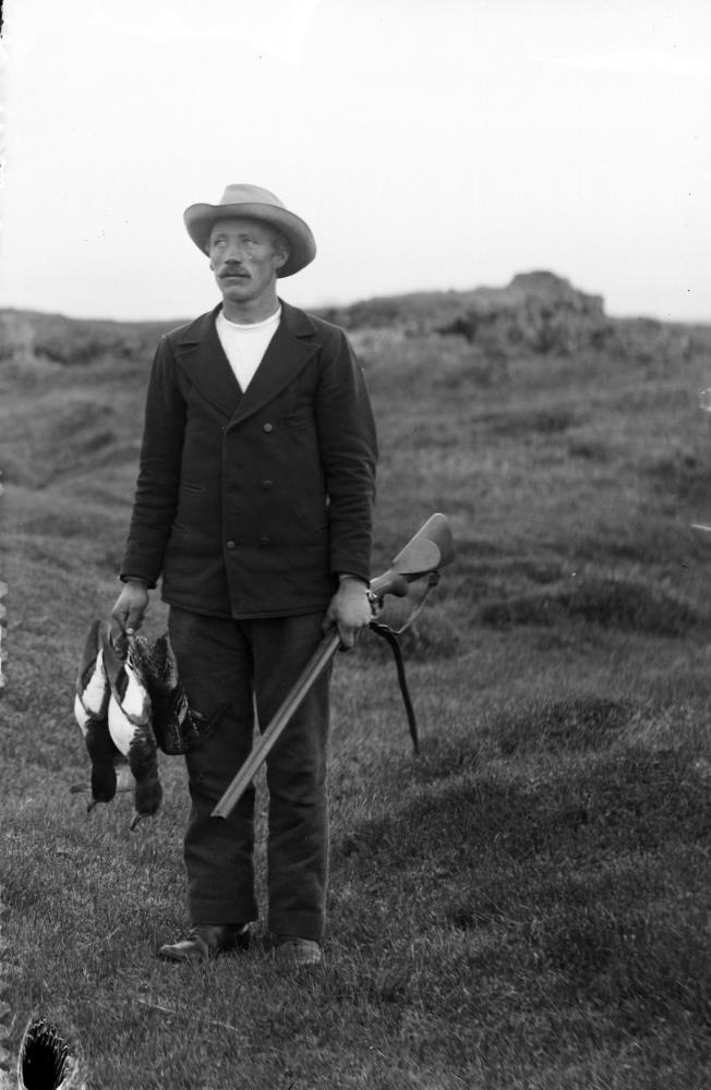 Kristján Helgason f.5.8.1882, með byssu og veiðbráðina endur, Haganesi