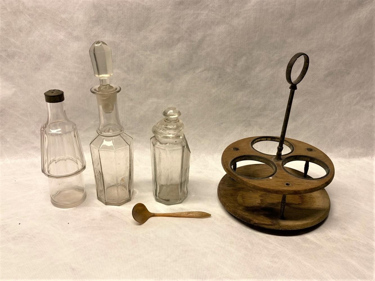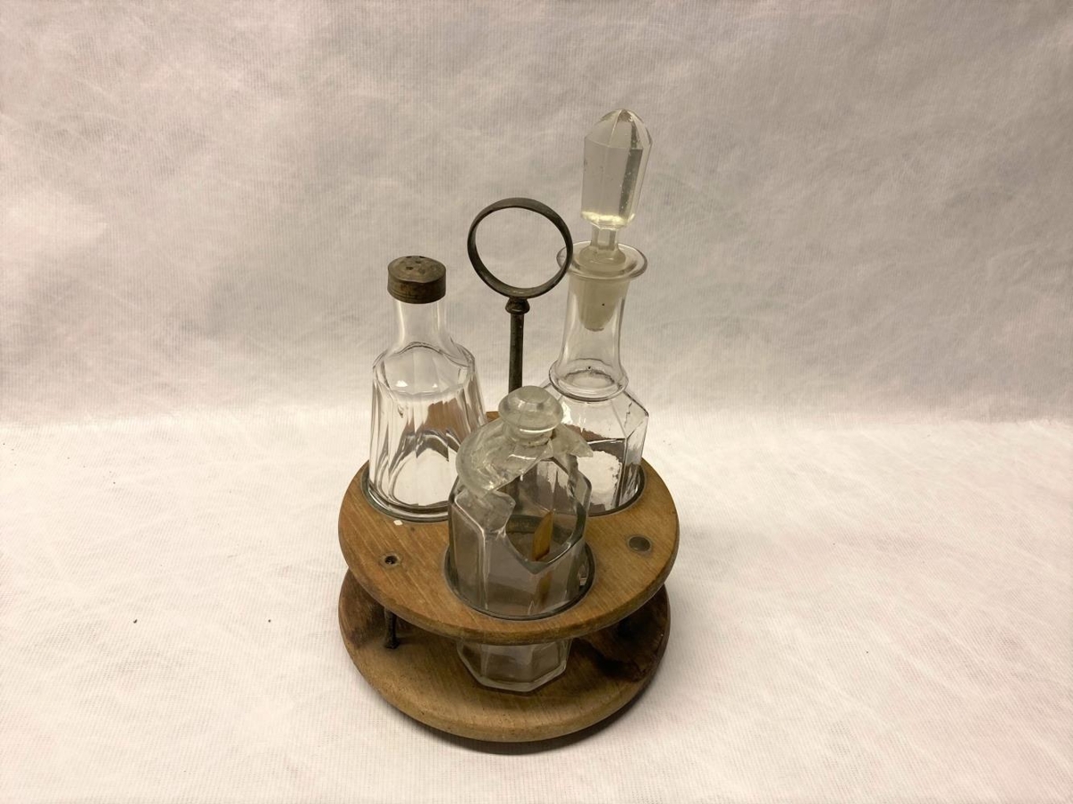 Sett með flösku fyrir edik, saltstauk og krukku með loki og skeið úr horni. Allt úr glæru gleri í statífi úr við með málmhaldi. Á miða á botni stendur m skrift ÞT: úr búi Sigurðar, Skúmsstöðum. Frá Skarðshlíð.