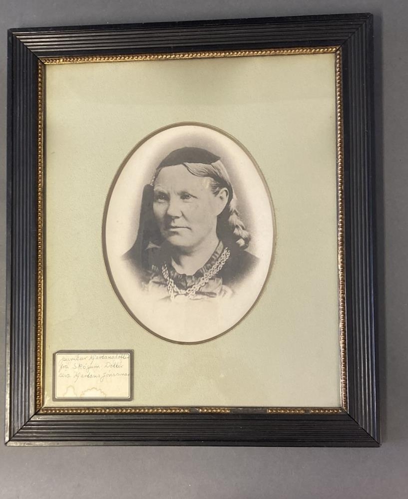 Stækkuð, innrömmuð ljósmynd af Þuríði Kjartansdóttur. Hún var langamma gefanda. Myndin er frá Valþjófsstöðum.