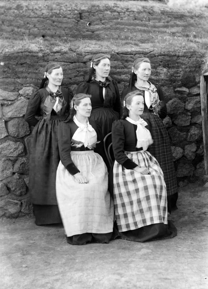 Konurnar eru allar á peysufötum með slifsi úr ólíkum efnum og hnýtt með ýmsum hætti. Hnýting slifsisins var tískubundin og ein leið til að móta sér sérstöðu í notkun peysufata. Slifsi voru yfirleitt búðarvara en svuntur ýmist heimaofnar eða keyptar. Þessar virðast flestar vera keyptar. Húfurnar eru allar áþekkar og hafðar fremur aftarlega. Í bakgrunni er bæjarveggur, grjóthlaðinn með torfþaki.(ILB)