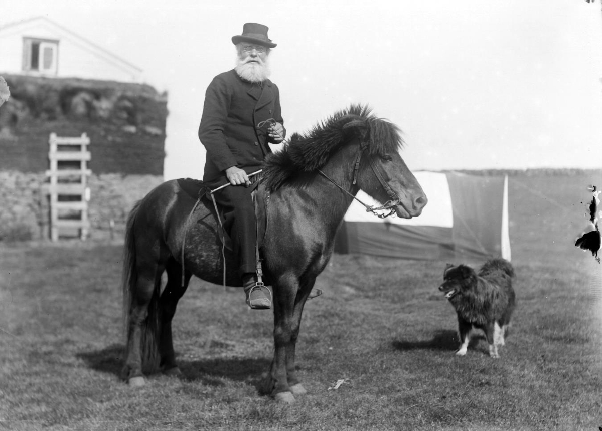 Guðni situr á hesti í heimagerðum fötum og á íslenskum skóm. Hann er með kringlótt spangargleraugu. Hesturinn er með stangabeisli með einföldu höfuðleðri og taumi úr grönnu hampsnæri. Maðurinn heldur á nýsilfurbúinni svipu úr spanskreyr með leðuról. Hnakkurinn er allur úr leðri; löf, seta, hnakktöskugjarðir og reiði. Yfirdýnan er riffluð og stoppuð. Ístöðin eru einföld og úr kopar. Faxið er snyrt en taglið er óklippt og sítt og dregst við jörð. Hundur stendur hjá. Húsveggur með litlum glugga og uppreistum stiga í bakgrunni. Við til hægri er tjald sem Bárður hefur stillt upp sem baktjaldi fyrir myndatökur sínar. (ILB)