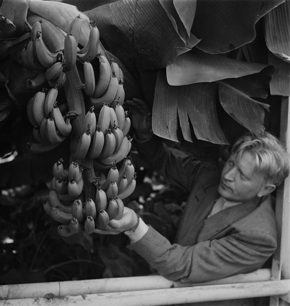 Garðyrkjuskóli ríkisins sem tók til starfa árið 1939 var á Reykjum. Tekið í gróðurhúsi. Unnsteinn Ólafsson, skólastjóri Garðyrkjuskólans í Reykjum, skoðar banana.