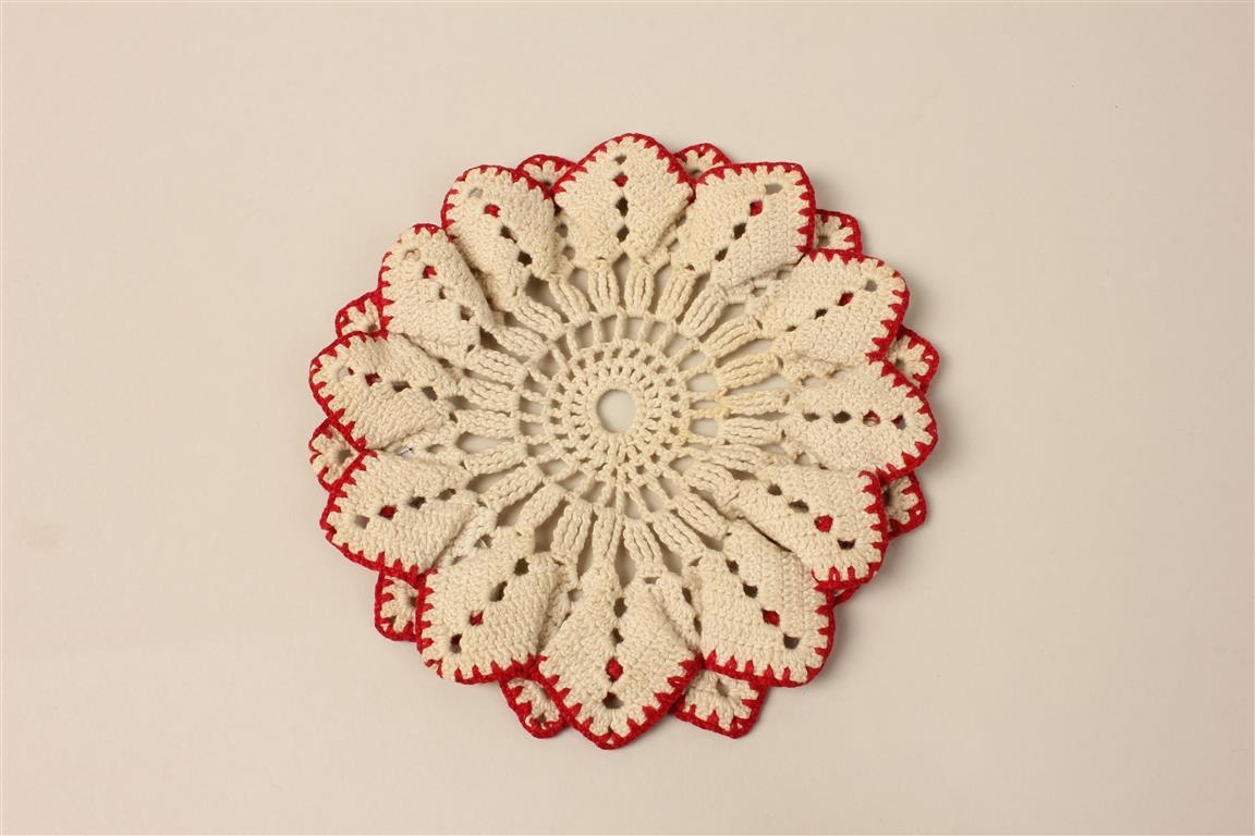Kringlótt hekluð eldavéladúlla kremuð að lit með rauðum hekluðum kanti í kring.