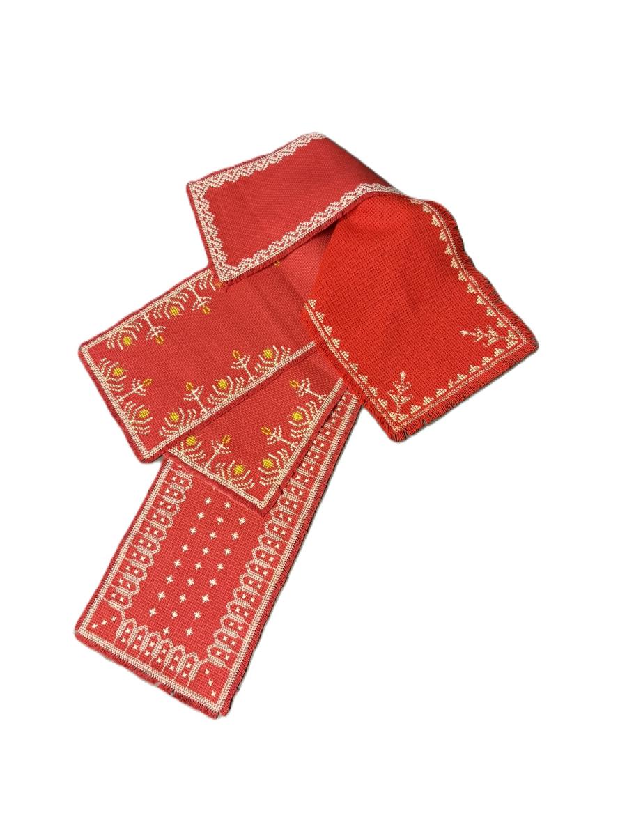 Rauður, útsaumaður jólalöber. Krosssaumur og herpisaumur í hvítu og gulu.