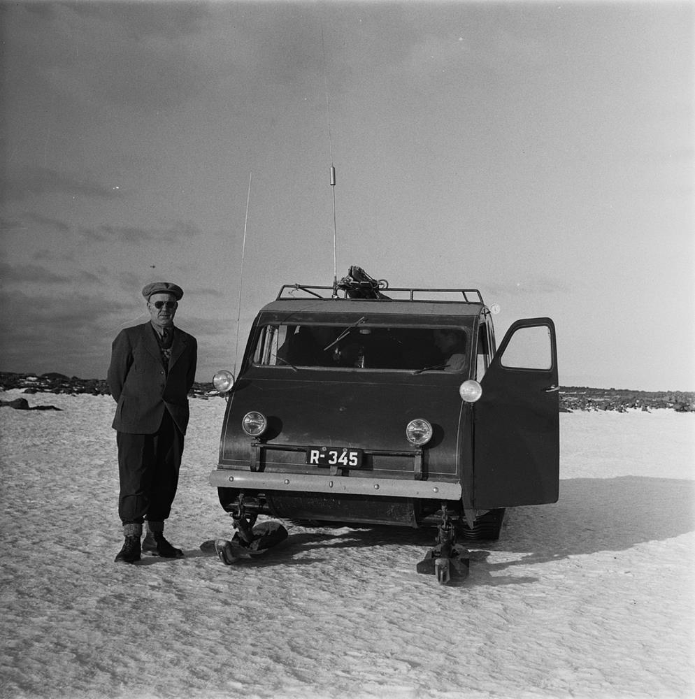 Árnessýsla. Bláskógabyggð. Þingvellir. Þingvallavatn. Maður og snjóbíll frá Guðmundi Jónassyni.