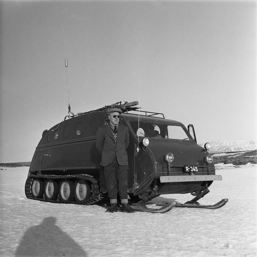 Árnessýsla. Bláskógabyggð. Þingvellir. Þingvallavatn. Maður og snjóbíll frá Guðmundi Jónassyni.