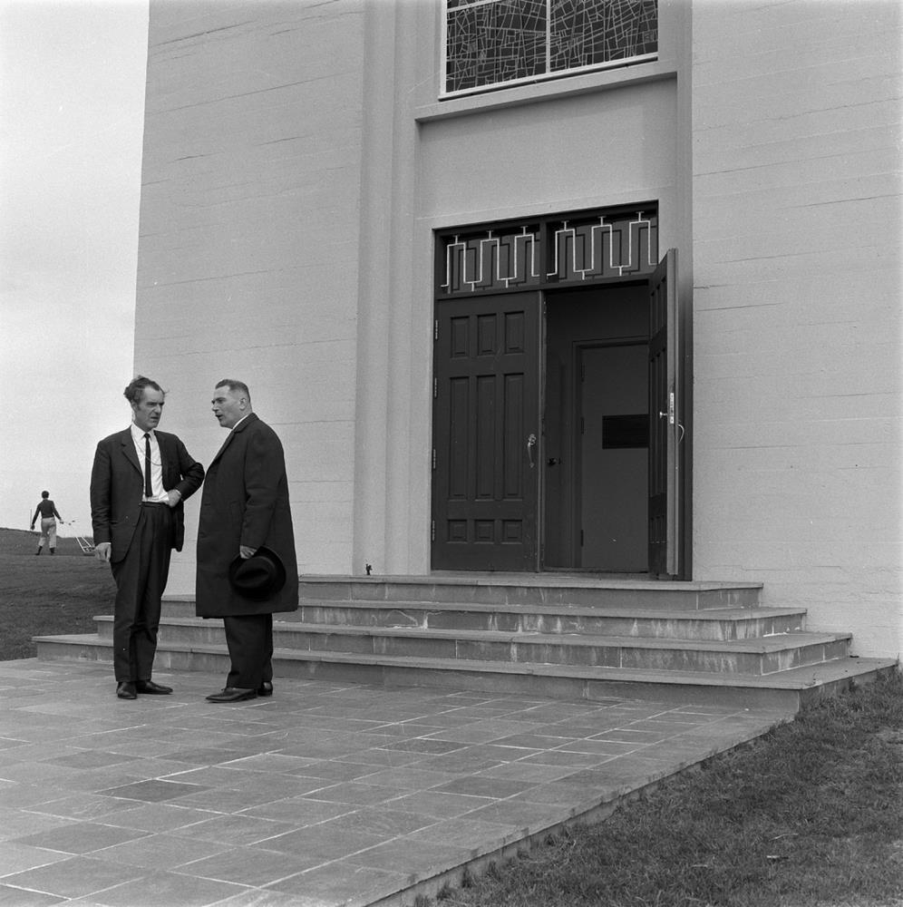 Árnessýsla. Bláskógabyggð. Skálholt. Skálholtskirkja. Sigurbjörn Einarsson stendur við kirkjutröppurnar ásamt öðrum manni.