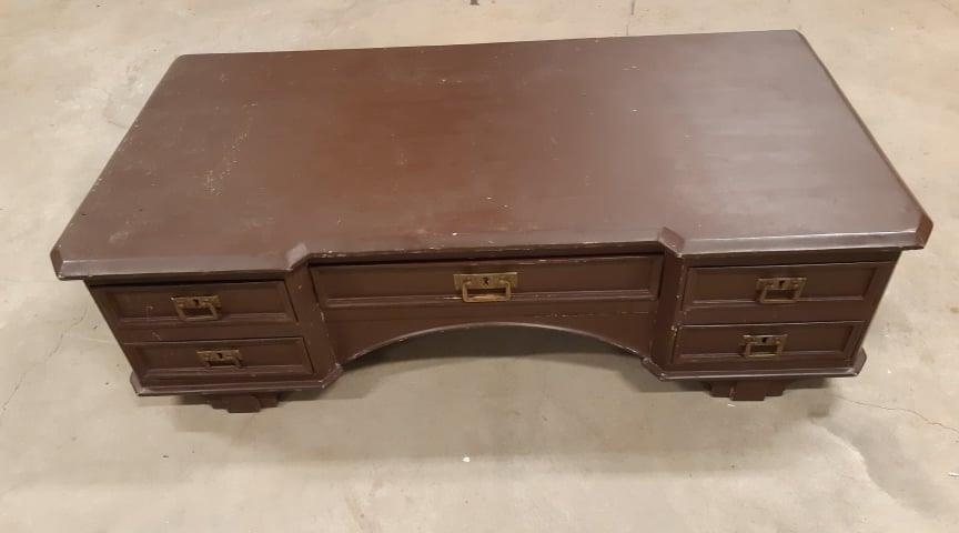 Brúnmálað skrifborð á fjórum renndum löppum. Fimm skúffur eru í skrifborðinu og allar með höldur.