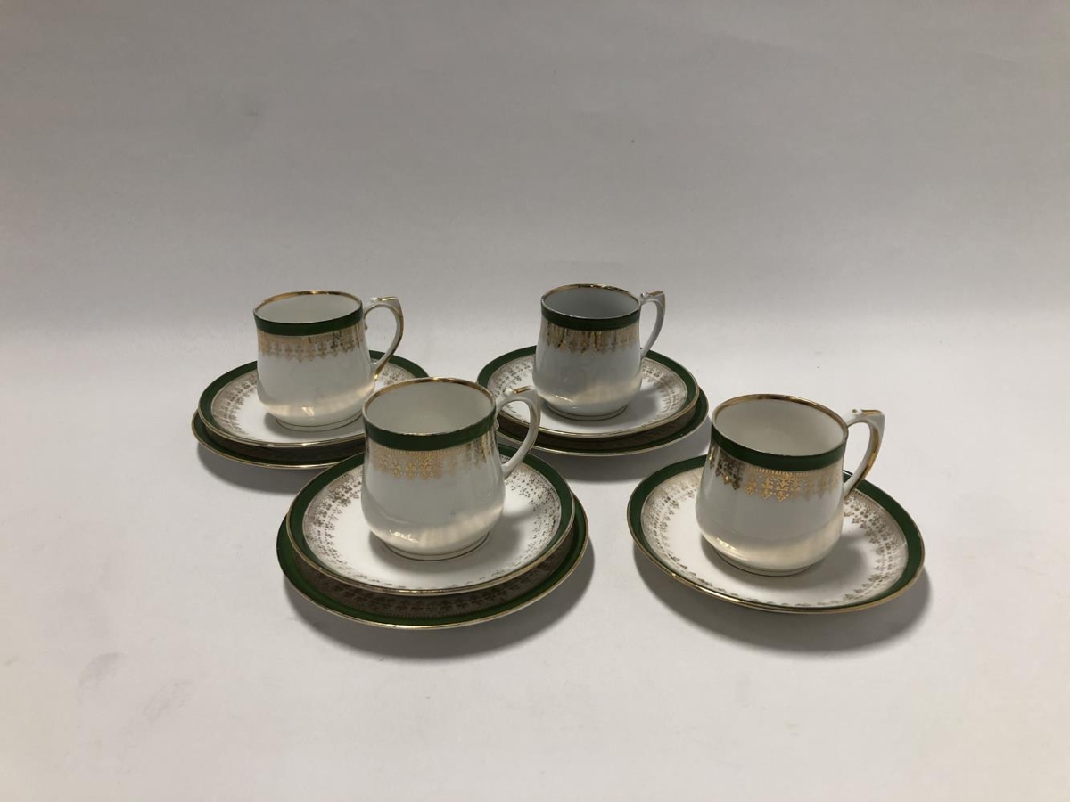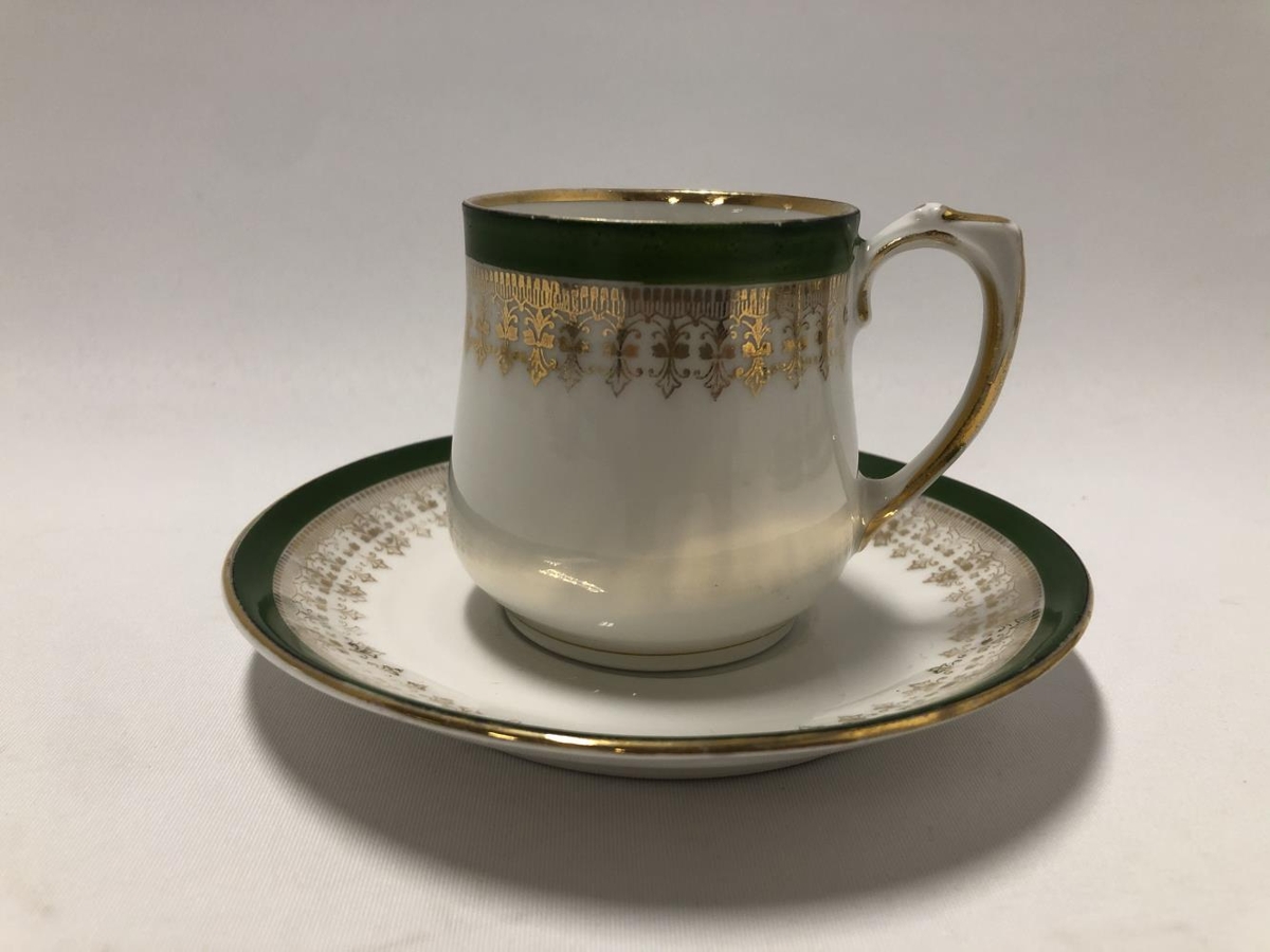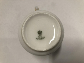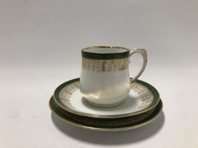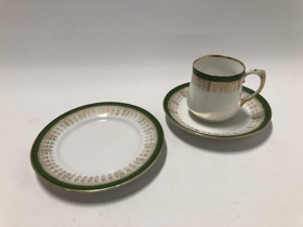 Bollastell úr línu þýska postulínsframleiðandans C.T. Altwasser. Stimpill undir gripum er úr framleiðslulínu sem var til sölu einhvern tíma á árabilinu 1909-1934. Fjórir bollar með undirskálum og þrír hliðardiskar. Hvítt með grænni, nokkuð breiðri rönd út við jaðar, gylltri línu yst og gylltu munstri fyrir innan. Bollastellið var brúðargjöf árið 1911.