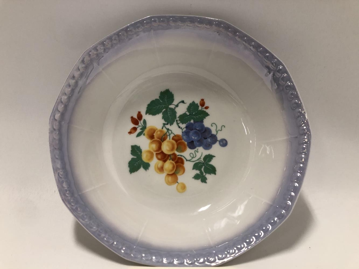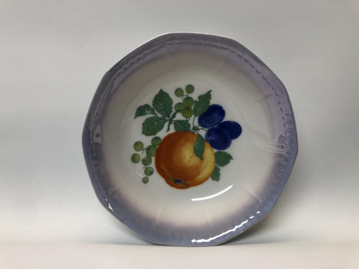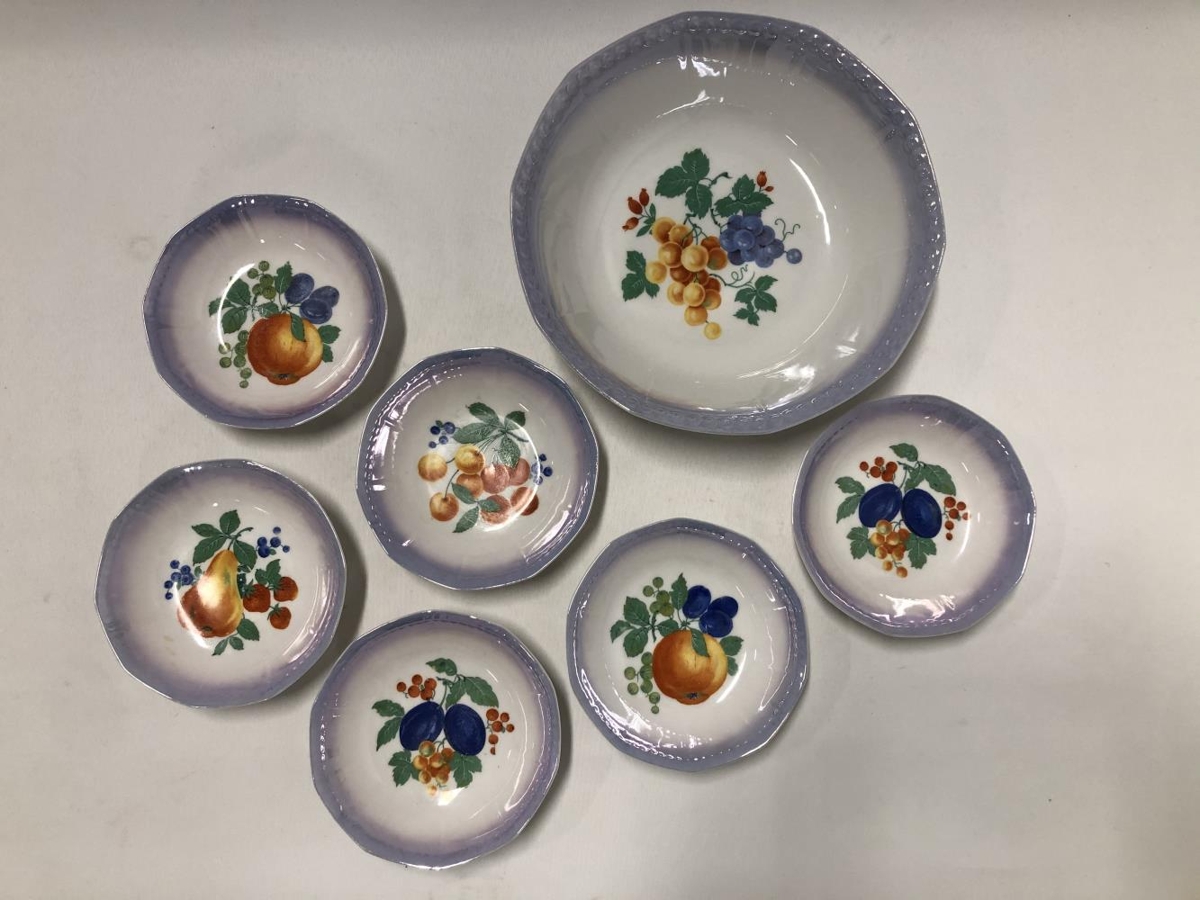 Skálasett, gæti verið eftirréttasett. Ein stærri skál, þvermál: 21 cm, hæð: 5,5 cm. Sex minni skálar, þvermál: 12 cm, hæð: 3 cm. Allar skálarnar eru hvítar í grunninn með eins konar blárri skeljaáferð á börmum. Myndir af ýmsum ávöxtum eru í hverri skál, í stærstu skálinni er mynd af vínviði. Í minni skálunum eru fjórar mismunandi útgáfur af ávaxtamyndum. Litirnir eru bjartir og tærir. Samkvæmt Ernu Marlin, gefanda, málaði Guðjón Samúelsson (húsameistari) myndirnar ásamt afasystur hennar Margréti Einarsdóttur.