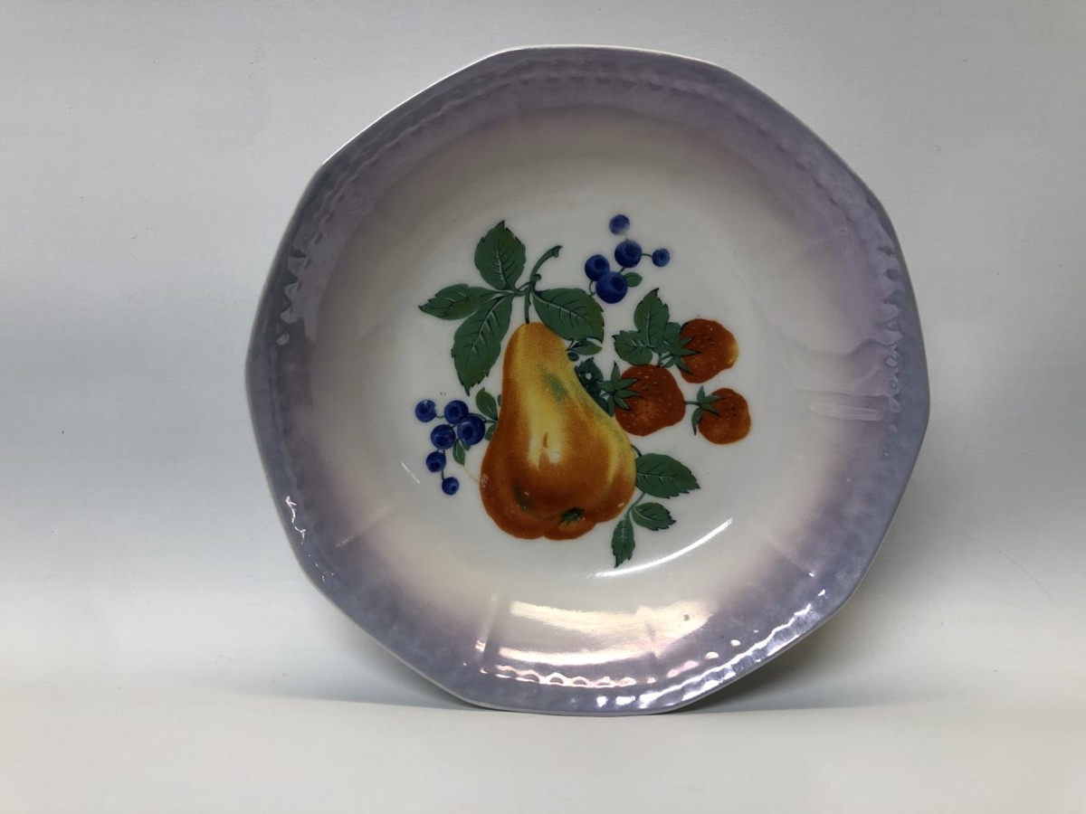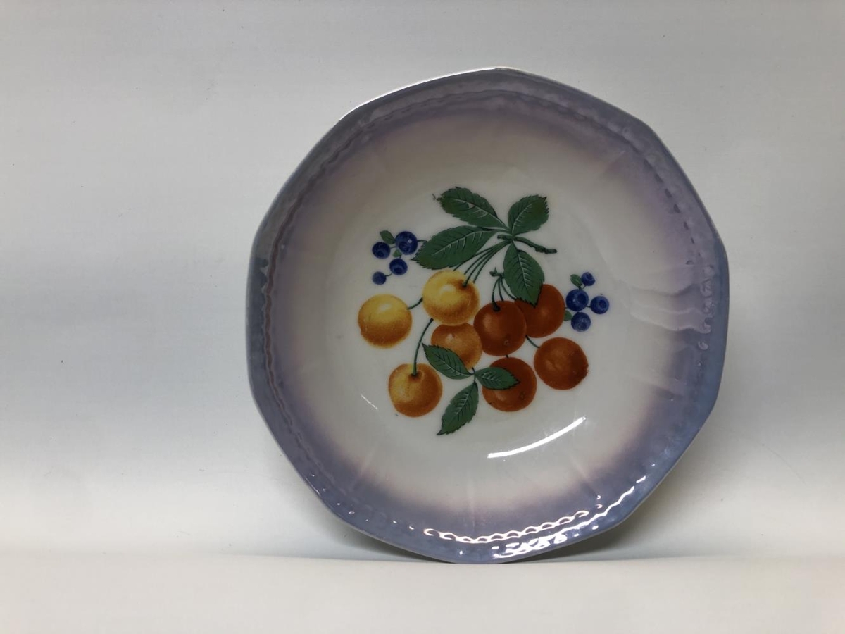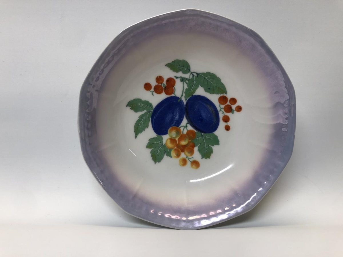 Skálasett, gæti verið eftirréttasett. Ein stærri skál, þvermál: 21 cm, hæð: 5,5 cm. Sex minni skálar, þvermál: 12 cm, hæð: 3 cm. Allar skálarnar eru hvítar í grunninn með eins konar blárri skeljaáferð á börmum. Myndir af ýmsum ávöxtum eru í hverri skál, í stærstu skálinni er mynd af vínviði. Í minni skálunum eru fjórar mismunandi útgáfur af ávaxtamyndum. Litirnir eru bjartir og tærir. Samkvæmt Ernu Marlin, gefanda, málaði Guðjón Samúelsson (húsameistari) myndirnar ásamt afasystur hennar Margréti Einarsdóttur.