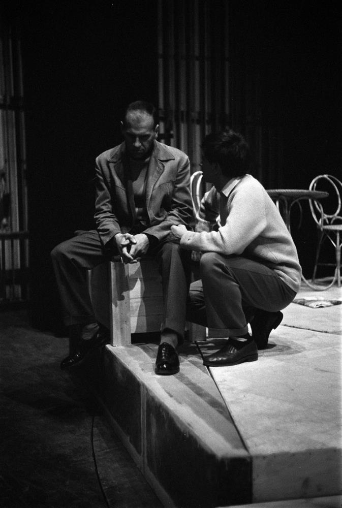 Leikæfing í Þjóðleikhúsinu. Tveir karlmenn spjalla saman á sviðinu.