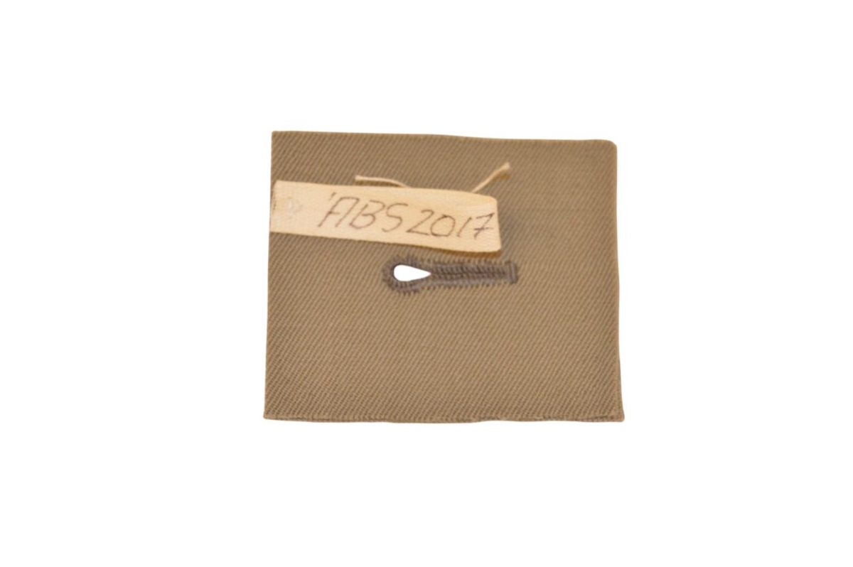 Saumaprufa. Herrafatahnappagat. Einnig notað á utanyfirflíkur. Hnappagatið er handsaumað. Það er formsniðið í annan endann til að búa til pláss fyrir tölufestingu. Til að fá rúnninginn var klippt upp í efnið eða klippt örlítið gat. Efnið er ullargaberdín (stríðs-gaberdín).