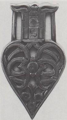 Beislisbúnaður, ennislauf og eyrnaádrættir, verk Ólafs Þórarinssonar frá Seglbúðum í Landbroti (1768-1840). Valdimar fékk gripina hjá Geir Gíslasyni í Gerðum í Landeyjum (sbr. ritgerð Þ.T. í árbók fornleifafélagsins 1985).