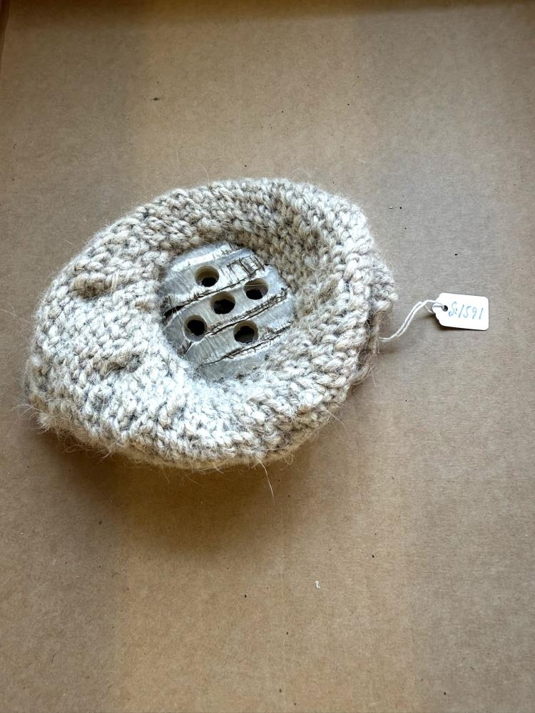 Hrútapoki saumaður með kappmelluspori og með speldi úr hrútshorni, gerður að fyrirsögn Jóns Pálssonar á Seljalandi (f. 1902). Afhent af safnverði, Þ.T. og unnið af honum.