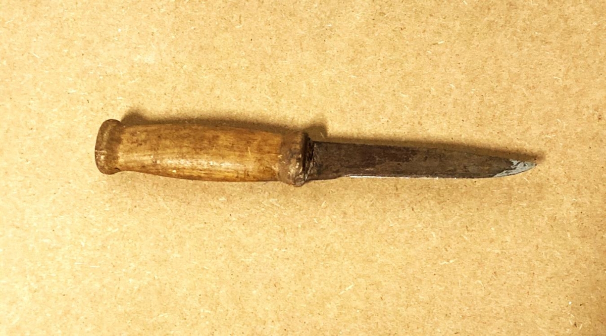 Skurðarhnífur, tréskeftur. Lengd 24,5 cm. Úr dánarbúi Gísla Stefánssonar bónda í Ystakoti í V-Landeyjum.